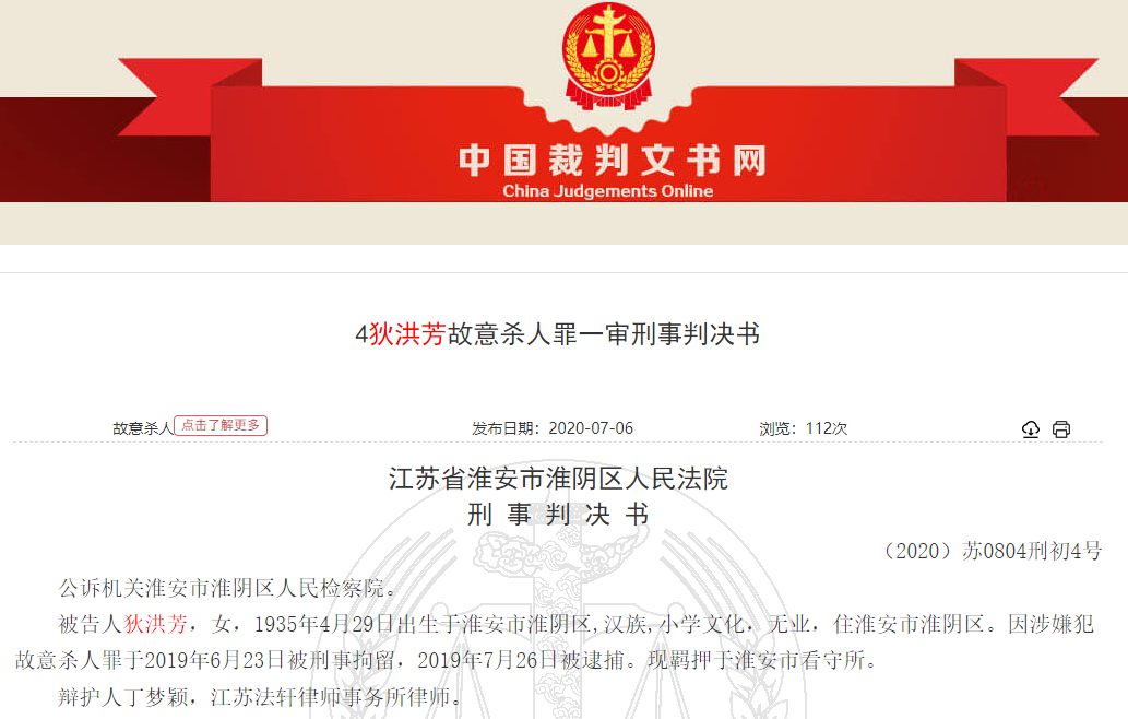 最终,江苏省淮安市淮阴区法院作出判决:狄洪芳犯故意杀人罪,判处有期徒刑十年。